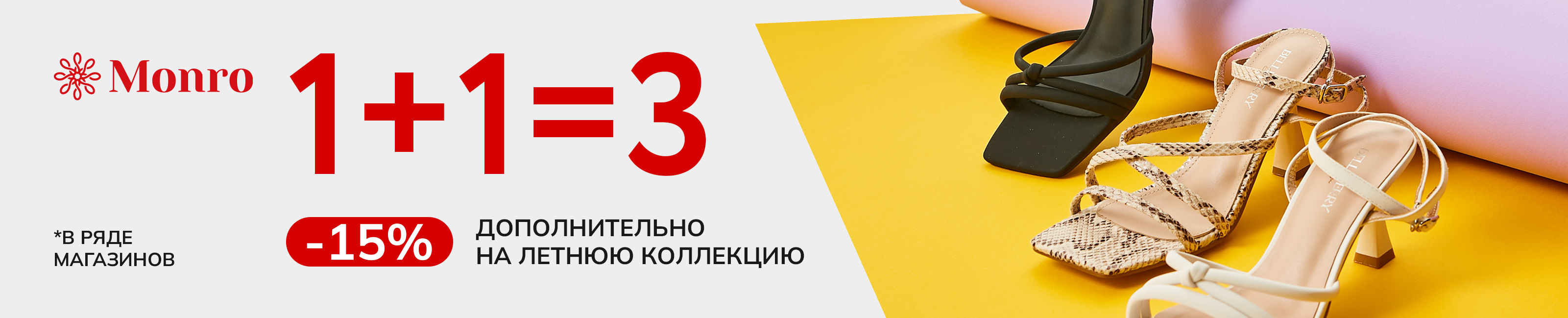 Условия акции: в ряде магазинов бренда MOnro c 18.07 по 22.07.2025 г. действует дополнительная выгода: на все товары из летней коллекции обуви, при приобретении по акции 1+1=3, предоставляется дополнительная скидка -15%, которая применима уже на действующие скидки акции "третий товар бесплатно".