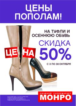 Только с 3 по 30 октября 2011г. обувные супермаркеты МОНРО проводит акцию: женские и мужские туфли, а также модели из осенней коллекции можно купить за ПОЛЦЕНЫ!!!!