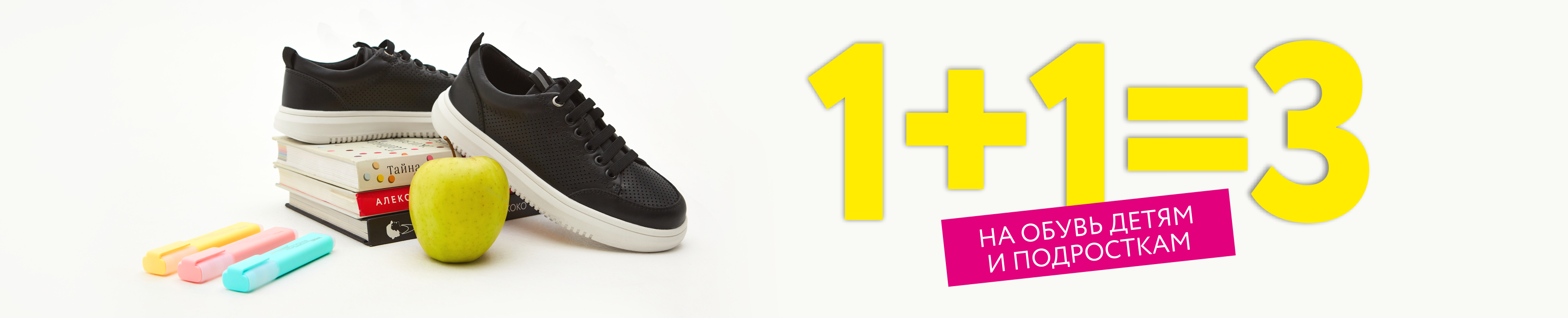 Условия акции: при покупке трёх пар детской и подростковой обуви, третья пара с наименьшей стоимостью в чеке предоставляется покупателю бесплатно. В чеке скидка, равная 100% стоимости третьей пары по наименьшей цене, расписывается путём пропорционального уменьшения стоимости каждого отдельного приобретаемого товара. Акция распространяется на детскую и подростковую обувь как с белым одинарным ценником, так и на обувь со скидкой по двойному ценнику. Предоставляемая по акции скидка не суммируется со скидкой по дисконтной карте покупателя и применением бонусов. На приобретаемые по акции товары может быть предоставлена рассрочка.