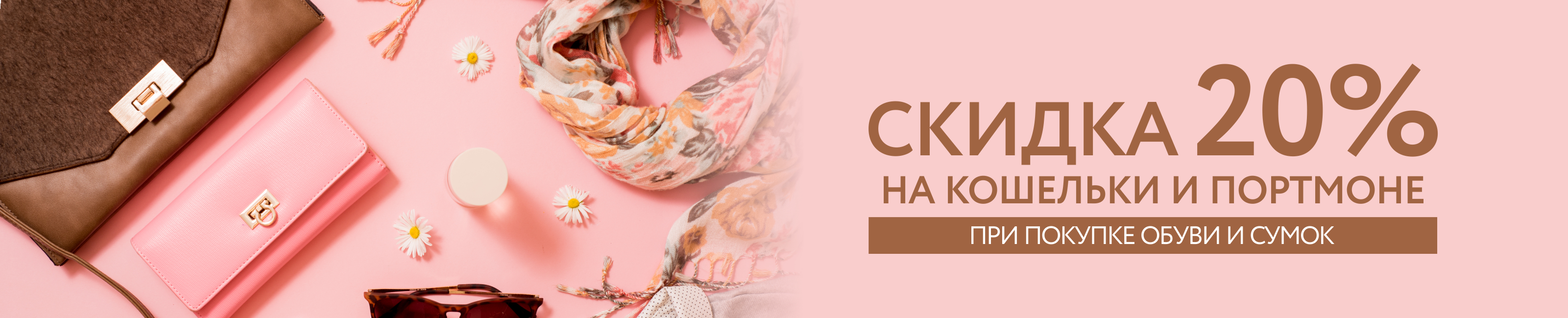 Условия акции: при совместной покупке в одном чеке обуви и товаров из ассортимента кошельков, портмоне, на аксессуары данной товарной группы предоставляется скидка 20%. Акция распространяется только на товары с белыми ценниками, не участвующие в других спецпредложениях. Скидка по акции не суммируется со скидкой по карте покупателя.