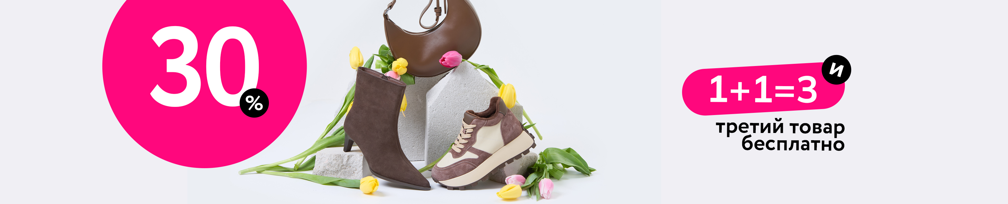 Вместе с весной в Monro приходит двойная выгода: ваша любимая акция "1+1=3" и беспрецедентная скидка -30 на всю весеннюю коллекцию. Теперь третий товар из числа хитов и трендов весенней обуви можно получить со скидкой -30% и запасти стильные модели для родных, воспользовавшись акцией "1+1=3".