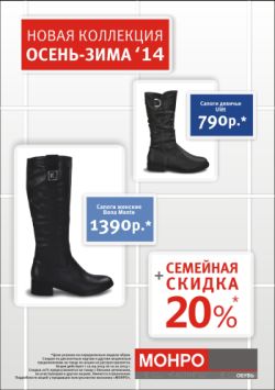 В тот же период Вы и Ваши близкие можете выгодно приобрести обувь для всех членов семьи. Покупайте в «Монро» товары с одинарными белыми ценниками, не участвующие в других акциях, на сумму от 790 рублей и Вы получите купон на скидку 20%**! Получить скидку по купону Вы сможете при покупке женской, мужской и детской обуви с 5 по 13 октября**.