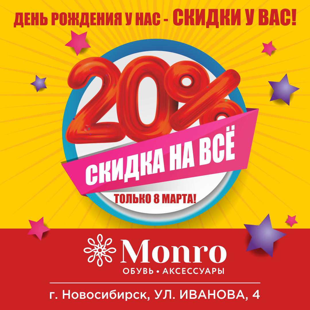 У магазина МОНРО по адресу ул. Иванова, 4 юбилей! Вот уже 15 лет любители стильной и качественной обуви радуют себя приятными приобретениями по выгодной цене именно здесь. В честь знаменательного события на весь ассортимент магазина 08.03.2020 г. действует скидка 20%. Праздник у нас - подарки вам! Успейте купить все, что нравится с приятной экономией. Поздравьте любимый магазин МОНРО выгодными покупками.