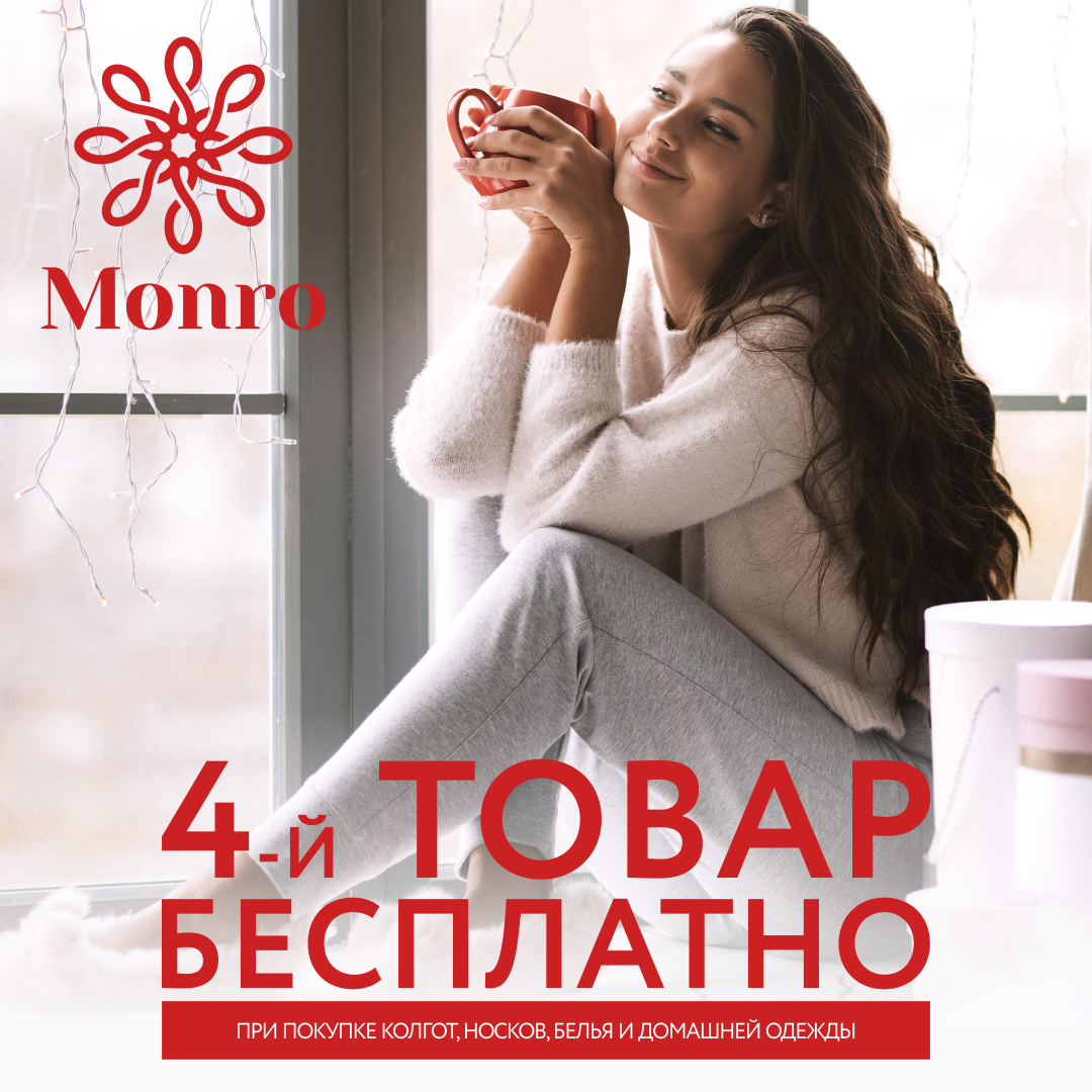 Условия акции: при покупке четырёх и более товаров из ассортимента носков, колгот, белья и домашней одежды, на каждый четвертый товар по наименьшей стоимости предоставляется скидка 100%, пропорционально расписанная по всем товарам в чеке.