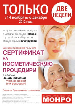 Только две недели - с 14 ноября по 6 декабря 2012 года — при совершении покупок в магазинах обуви «Монро» города Новосибирска на общую сумму 3000 рублей Вы гарантированно получите СЕРТИФИКАТ НА КОСМЕТИЧЕСКУЮ ПРОЦЕДУРУ в салоне I.C.Lab Individual — уход за кожей или волосами!